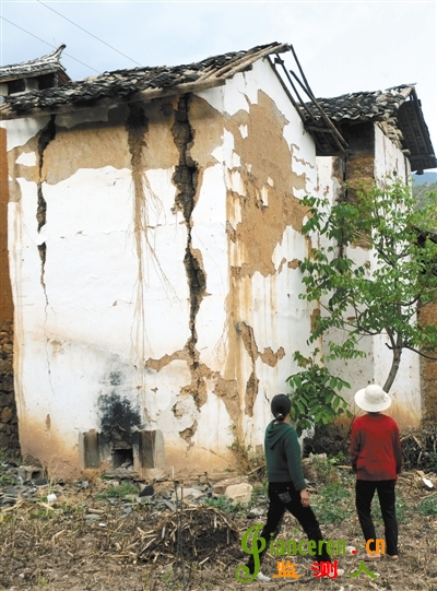 4月17日,云南大理洱源震區煉鐵鄉長邑村震裂的烤煙房。